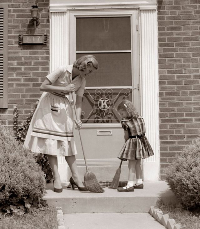 Fotografia 5: A condição de “belas, recatadas e do lar” perpetua-se na educação das mães para com suas filhas, quando determinados símbolos que definem a condição da mulher aceita socialmente são reforçados, como: a cor rosa, brinquedos que se referem ao trabalho doméstico, bonecas que precisam ser cuidadas e alimentadas por suas “mães”, a fragilidade posta com a imposição de que certas brincadeiras são apenas para os meninos, etc. Imagem disponível no site https://www.vintag.es/2016/12/vintage-housewives-32-lovely-vintage.html. Acesso em mar 2023.