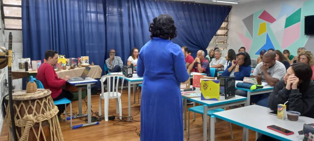 Em segunda, tivemos um intervalo onde foi ofertado a cada educador um café da tarde, em seguida voltamos dialogando com outra dimensão da cultura afro-brasileira que é a musicalidade. Para esse processo envolvemos alguns educadores para tocar os seguintes instrumentos: atabaque, berimbau e pandeiro e com o toque do São Bento Grande de Angola, acompanhado de cantos e palmas cantamos a música Africanidades. A estrofe foi cantada pelos professores e o refrão pela turma que estava participando da formação no modelo de “pergunta” e “resposta”: