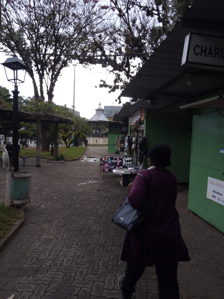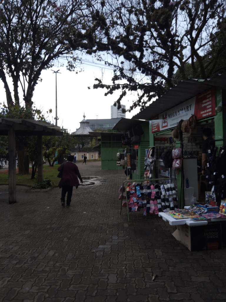 Fotografia 11: Algumas stands com produtos para venda na Praça da Autonomia, e ao fundo o Coreto. Registro de Cynara Martins por celular em 14/07/2023.