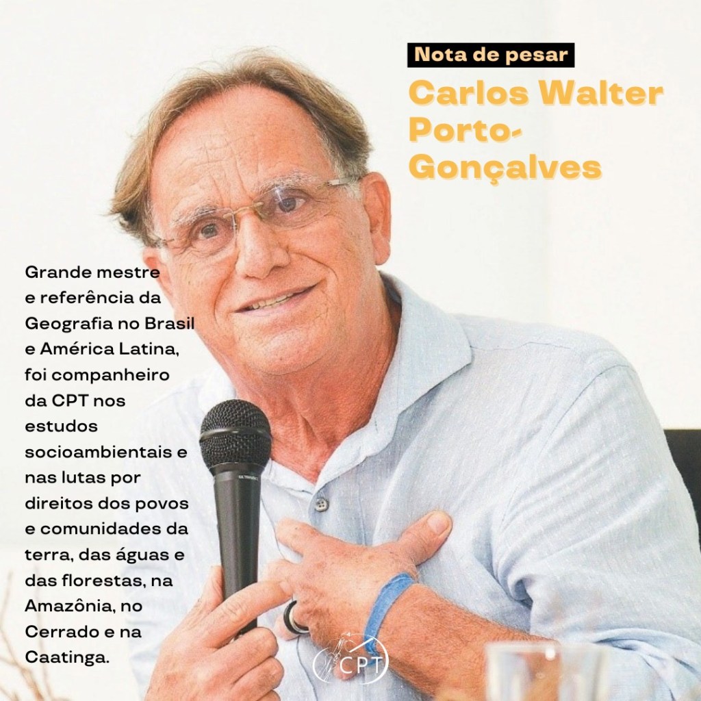 “A Comissão Pastoral da Terra – CPT, consternada, lamenta profundamente o falecimento de Carlos Walter Porto-Gonçalves, geógrafo e escritor, professor aposentado da Universidade Federal Fluminense, ocorrido ontem à noite, em Florianópolis – SC. Entre suas múltiplas e inestimáveis contribuições, nos campos da geografia social e da ecologia, no Brasil e na América Latina, tem especial relevância sua assessoria aos povos e comunidades do campo, das águas e das florestas. O que o levou a se aproximar de nós da CPT, na documentação, análise e divulgação dos dados de conflitos no campo, que fazemos há 38 anos, e na formação de nossos/as agentes. Mas não só, também na base, nos territórios, junto às comunidades, em pesquisa e ação pastoral, em diversas situações de organização, formação e mobilização pelos direitos à terra e pela vida digna na terra, em equilíbrio com a natureza. Foi ele que nos ensinou a interação entre o “metabolismo social da natureza e a reinvenção dos territórios”, entre tantas outras lições de profundidade e alcance em nossa vida e trabalho. Nesta convivência de anos, Carlos Walter se revelava um ser humano grandioso, na atenção, na escuta e no carinho a todos e todas, em especial aos camponeses e camponesas. De verdade, queria e se entregava a construir novas relações humanas, sociais, políticas, ecológicas. Ansiava por um Brasil, uma América Latina e um mundo de harmonia, mas que fossem frutos da justiça, da igualdade e do respeito, conquistados “pelos de baixo”. Vai nos fazer muita falta, mas buscaremos seguir seus passos e ensinamentos! Querido mestre Carlos Walter, tanto bem e luz nos deste! Gratidão imensa! Deus te acolha na plenitude do Bem e da Luz! É nosso desejo e oração! Comissão Pastoral da Terra. Goiânia, 07 de setembro de 2023.”
