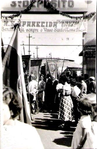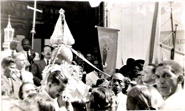 Fotografia 3: Vista externa da Igreja Matriz de São Sebastião, com seu pórtico ao fundo, na saída da procissão em homenagem a Nossa Senhora Aparecida (vê-se em destaque a imagem desta), padroeira do Brasil para os católicos. Fotografia do acervo Rádio Três Rios, de fevereiro de 1959, sem autor conhecido.