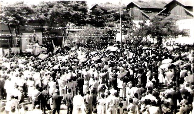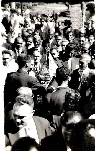 Fotografias 1 e 2: Vista externa da passagem da imagem de Nosso Senhora Aparecida pela cidade de Três Rios/RJ, em fevereiro de 1959, do acervo Rádio Três Rios, com fotógrafo desconhecido.