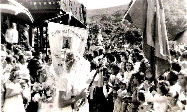 Fotografia 5: Vista externa da chegada da procissão em homenagem a Nossa Senhora Aparecida, no antigo 3º Depósito da E. de F. Central do Brasil, em Três Rios/RJ. É possível vislumbrar a presença no primeiro plano de muitas crianças, a esquerda mais ao fundo um vagão de passageiros e em destaque a bandeira do Brasil. Fotografia do acervo Rádio Três Rios, de fevereiro de 1959, sem autor conhecido.