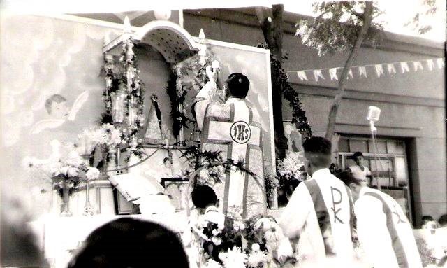 Fotografia 6: Vista externa da missa de inauguração da capela em homenagem a Nossa Senhora Aparecida, realizada no antigo 3º Depósito da E. de F. Central do Brasil, em Três Rios/RJ. Registro de um dos momentos da cerimônia religiosa, com o representante da Igreja católica ofertando a hóstia. Fotografia do acervo Rádio Três Rios, fevereiro de 1959, sem autor conhecido.