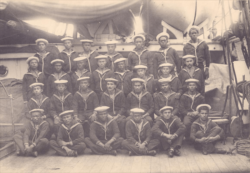Fotografia 1: Um grupo de marinheiros do Cruzador Benjamin Constant, fotografia de 1906, em Paris, França. Álbum 140 O Cruzador Benjamin Constant em Viajem de Instrucção. Foto 57407. Disponível em https://brasilianafotografica.bn.gov.br/brasiliana/handle/20.500.12156.1/4786.