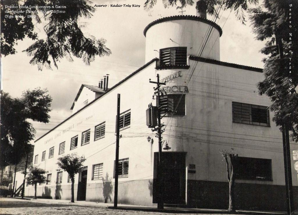 Fotografia 6: Antigo prédio da fábrica de Usina de Açúcar e Café Pérola, a Praça São Sebastião. Registro do acervo da Rádio Três Rios. Sem fotógrafo conhecido.