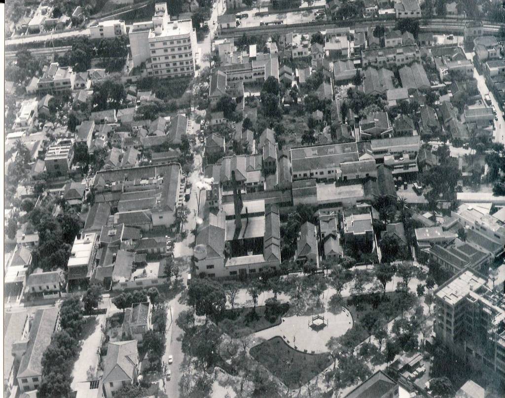 Fotografia 8: Imagem aérea do centro da cidade de Três Rios, no último quarto da década de 60 do século passado, destacando-se mais ao centro e abaixo a Praça São Sebastião, espaço urbano que percorreu todo o tempo histórico deste município com transformações várias, principalmente em seu entorno. Mais ao centro o prédio da Usina de Açúcar e Café Pérola, destaque na fotografia 6. A Praça São Sebastião será tema do nosso próximo artigo, ainda tratando sobre o patrimônio urbano, memória e fotografia.