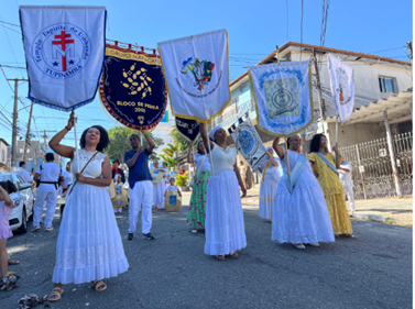 “Fomos parar na procissão a convite da Selma que é uma das lideranças da igreja do Rosário. Ela nos chamou contando um pouco sobre o evento que inicia a caminhada a partir da casa do Pai Dinho d’ Ogum e termina na Igreja do Rosário. Então dissemos sim porque aceitamos praticamente tudo o que a Igreja do Rosário nos pede. Eles são uma organização relevante, portanto sempre que pedem nosso apoio, é o que fazemos. E é dessa forma que começou a nossa participação nessa procissão. Com o tempo a nossa participação também foi ganhando novos sentidos de por exemplo estarmos próximos das lutas dos Terreiros e contribuir também nesses momentos em que eles estão organizando. Pessoalmente, acho que vários integrantes do Bloco que acabaram de se formar ou que participaram do último Carnaval, gente que acabou de chegar, acaba encontrando nessas nossas participações, o primeiro contato real com a diversidade. Então na procissão de Oxalá, para muita gente é o primeiro contato dessa relação com os Terreiros. No dia em que vamos para a procissão dos pretos velhos do Sr. Luiz, é o primeiro contato de alguém com uma gira, com um Terreiro. Acho que quando a gente vai ao Rosário é o primeiro contato de alguém com as Congadas, com o Samba de Bumbo, como outros grupos de Maracatu. Então todas as atividades são oportunidades de conhecer e zelar por esse mundo. Assim para quem está chegando no Bloco é uma forma deles entenderem que existem as culturas tradicionais pulsando. Tem um monte de gente nessa mesma onda que a gente está de brincar as tradições populares, de encontrar nelas, jeitos de estar no mundo…enfim, acho que é isso. Pessoalmente eu fico muito feliz quando estamos nestes eventos e, pensando exclusivamente nos integrantes novos do Bloco, acho que são sempre oportunidades de encontrar de verdade assim as tradições de matriz africana, as tradições brasileiras. Para além do cunho político importante de se manifestar contra a intolerância religiosa que é óbvio, faz todo o sentido estarmos juntos, acho importante apoiar, e do ponto de vista do percurso educativo das pessoas é importante elas estarem nesses lugares, conhecerem POR DENTRO as tradições populares, as tradições de matriz africana.”