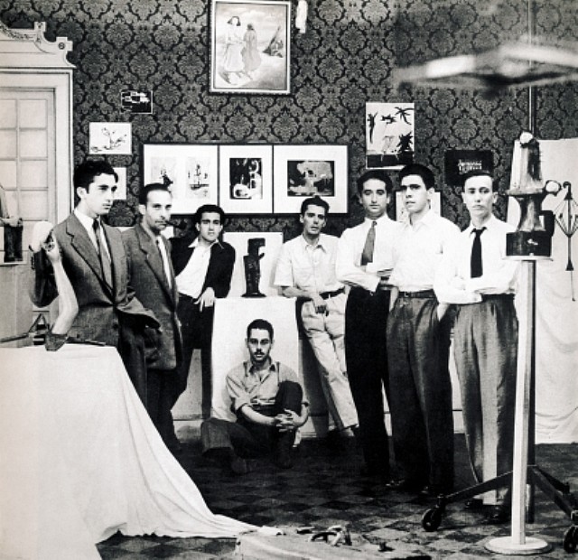 Grupo Surrealista de Lisboa, Portugal. Na foto, da esquerda para a direita: Henrique Risques Pereira, Mário Henrique Leiria, António Maria Lisboa, Pedro Oom, Mário Cesariny, Cruzeiro Seixas, Carlos Eurico da Costa e Fernando Alves dos Santos, durante a I Exposição dos Surrealistas (Junho/Julho, 1949).