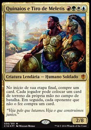 Lançado pela primeira vez em Theros, o card Guardiões de Meletis é a primeira representação textual de um casal gay dentro dos cards de Magic. O card representa apenas as estátuas de Quinaios e Tiro de Meletis – heróis que apareceram mais tarde, em um card na coleção Commander 2016 (Figura 2). Na história do jogo, Quinaios e Tiro encerram um governo tirânico em sua pólis e são escolhidos para governá-la “com o amor que nutriam um pelo outro e por sua pólis”. Sua história tem possível inspiração na vida real: Harmodius e Aristogeiton foram tiranicidas atenienses em 514 a.C.