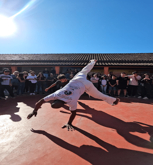 E, como última atividade do dia, tivemos a ilustre presença do mestre capoeira João Moreira, mais conhecido como Mestre Pelé, com quem os estudantes puderam conversar e aprimorar seus conhecimentos sobre as mais diversas facetas da capoeira, de modo a desenvolver não apenas habilidades físicas, mas também uma compreensão mais profunda da rica cultura afro-brasileira que permeia essa arte. A atividade contribuiu significativamente para o crescimento pessoal e artístico dos estudantes.