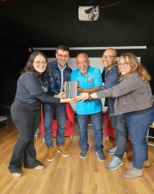 Livros doados pelos escritores Abílio e Bruno. (Dá direita para a esquerda: Profa. Tatiane, diretora da escola; escritor Abílio; escritor Bruno; Roberto e Sarita, membros do Núcleo Pedagógico e Especialista em Currículo e Analista Sociocultural da Unidade Regional de Ensino de Mauá). Créditos: Profa. Karla Nascimento Santos