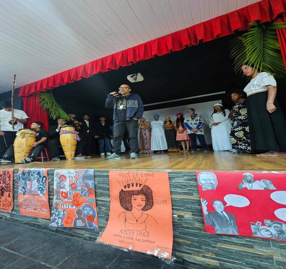 Num segundo momento, foi apresentada a peça teatral chamada Vozes da Consciência, encenada por um grupo de estudantes, que apresentou aos presentes, algumas personalidades negras que se destacam na História do Brasil e do Mundo e que, por vezes, passaram pelo processo de apagamento histórico. Eu mesma, constatei que não tinha ouvido falar de algumas dessas personalidades na escola, ou seja, não os conheci enquanto era estudante, mesmo tendo terminado meu ensino médio no ano de 2006. Essas personalidades homenageadas foram: Zumbi dos Palmares, Dandara dos Palmares, Carolina Maria de Jesus, Angela Davis, Martin Luther King, Malcom X, Luiz Gama, Luisa Mahin, Barack Obama, Teresa de Benguela, Conceição Evaristo, Nelson Mandela, Harriet Tubman, Machado de Assis, Grande Otelo, Abdias do Nascimento e Tia Ciata.