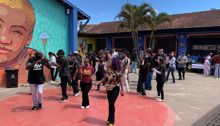 Já no período da tarde, os alunos puderam vivenciar duas práticas culturais: a primeira foi o Samba Rock, que é de origem paulista, com o Professor de Samba Rock, Ébano Sbrock, que trouxe bastante informação sobre o movimento dançante das casas de baile de São Paulo, além de ensinar alguns de seus principais passos.