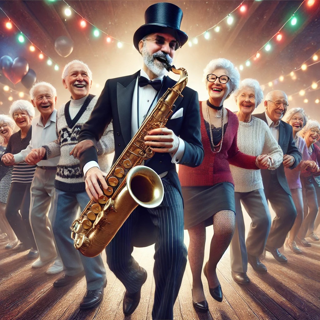A mulherada se soltou, gente! Uma gritaria, todo mundo dançando. Foi aí que Dona Olinda resolveu soltar a franga e gritou: – Vamos fazer um trenzinhooooo! A mulher grudou na cintura do saxofonista, que foi levado para o meio do salão.
