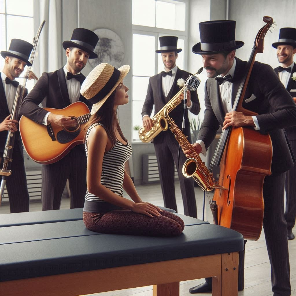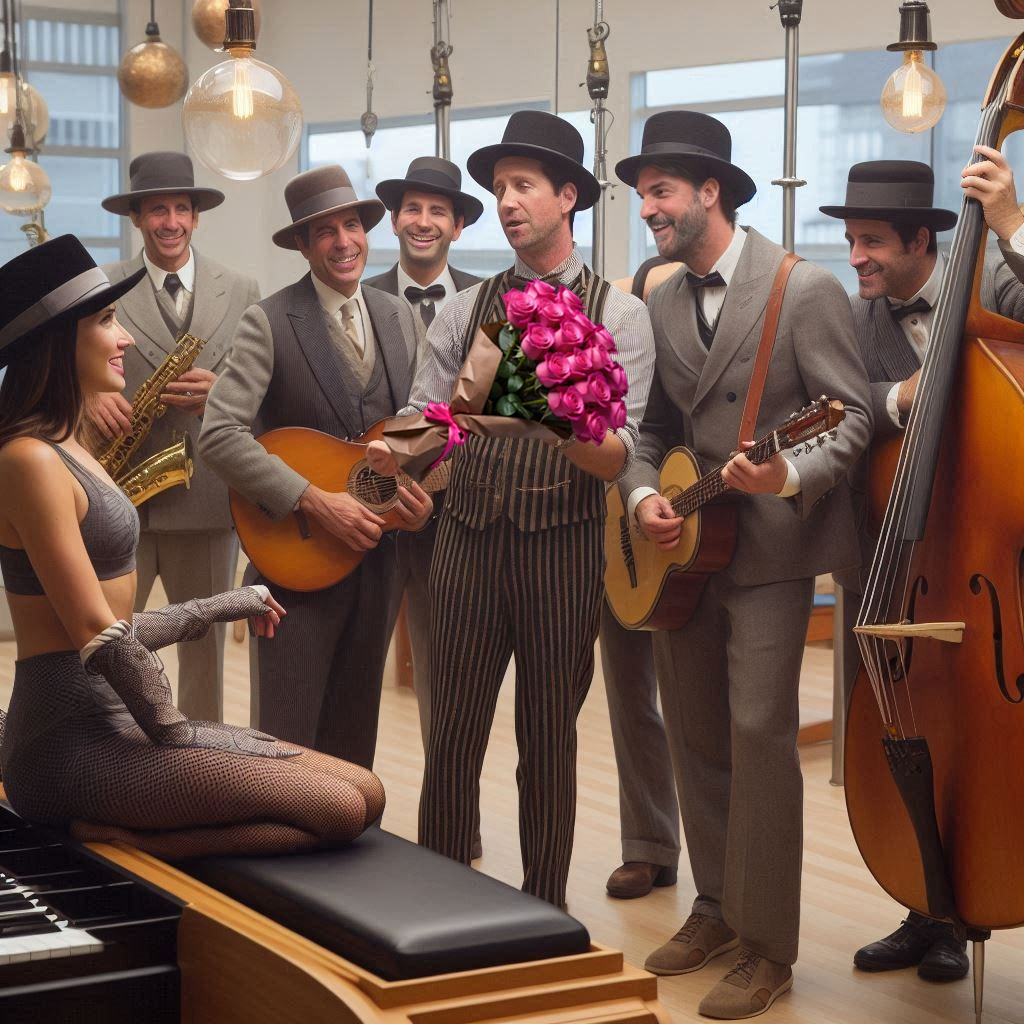 Os primeiros acordes invadiram o estúdio como um abraço inesperado. O som encheu o espaço, deslizando entre os aparelhos, pousando nos rostos atentos das alunas. Márcia virou-se devagar, e ali, diante dela, estava o grupo Serenata & Cia, trazendo música, e Guilherme, segurando um buquê de flores.