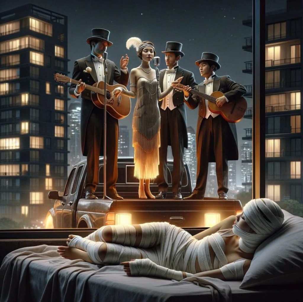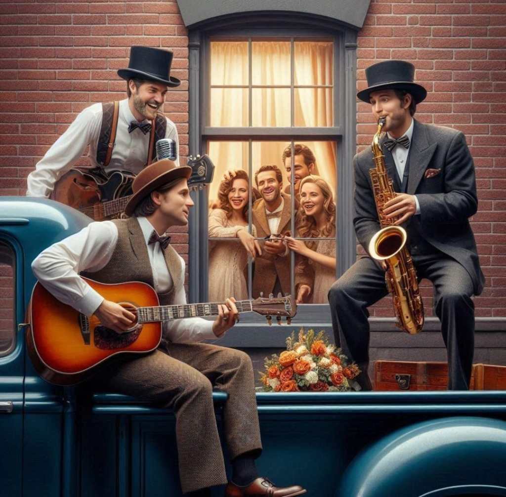 Nada de salões de festa ou encontros cheios de gente. Era época de distanciamento, mas o amor sempre encontra um caminho. E nesse caso, o caminho foi a caçamba de uma picape. No horário combinado, o grupo Serenata & Cia estacionou em frente ao prédio, munido de violões, microfones e um amplificador pequeno, mas cheio de intenções grandiosas.