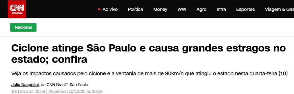 Manchete sobre o ciclone que atigiu o estado de São Paulo, em 10/12/2025. Fonte: Acesso em 02/04/2026.